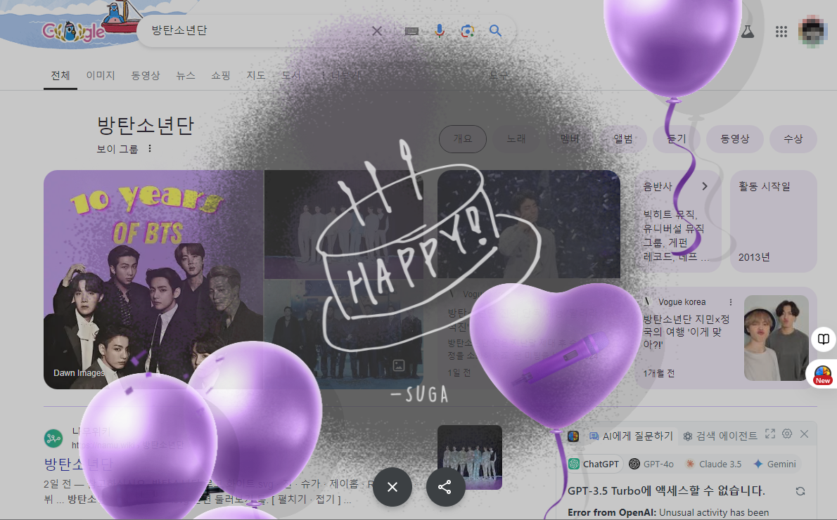 在谷歌搜索框中输入“BTS”、“비티에스”或“防弹少年团”,你会看到左侧出现一个气球图标。点击这个气球后,会出现各种有趣的效果。特别是,当你点击拿着麦克风的气球时,屏幕会变成紫色,并出现“I pupple you”的文字。点击后的气球效果可以通过点击X按钮来重置。