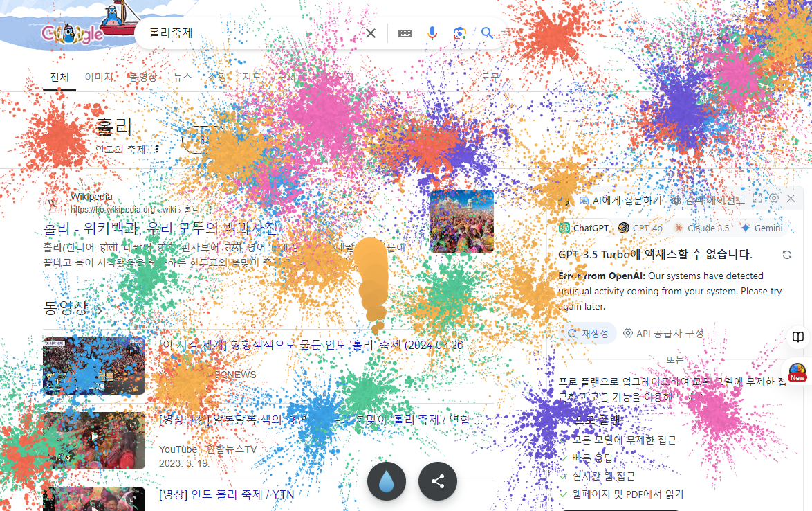 搜索“胡里节”时,屏幕上会出现一个颜料图标。点击这个图标后,你可以向屏幕投掷各种颜色的颜料。重置效果可以通过点击水滴图标来实现。